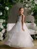 This graceful communion dress features a three dimensional design bodice with tiered horsehair bottom.