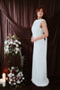 The straight, floor-length design creates a smooth, elegant line from top to bottom, giving the dress a timeless feel. It’s made from a structured fabric that holds its shape beautifully, so the whole look stays crisp and polished.